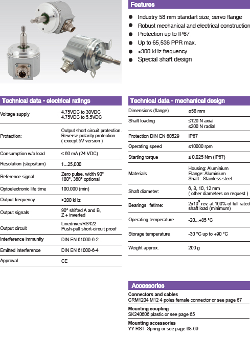 | ○ | 空載電流:≤ 60mA(24 VDC) | ○ | 分辨率(脈沖數/轉):1... 25000 | |||